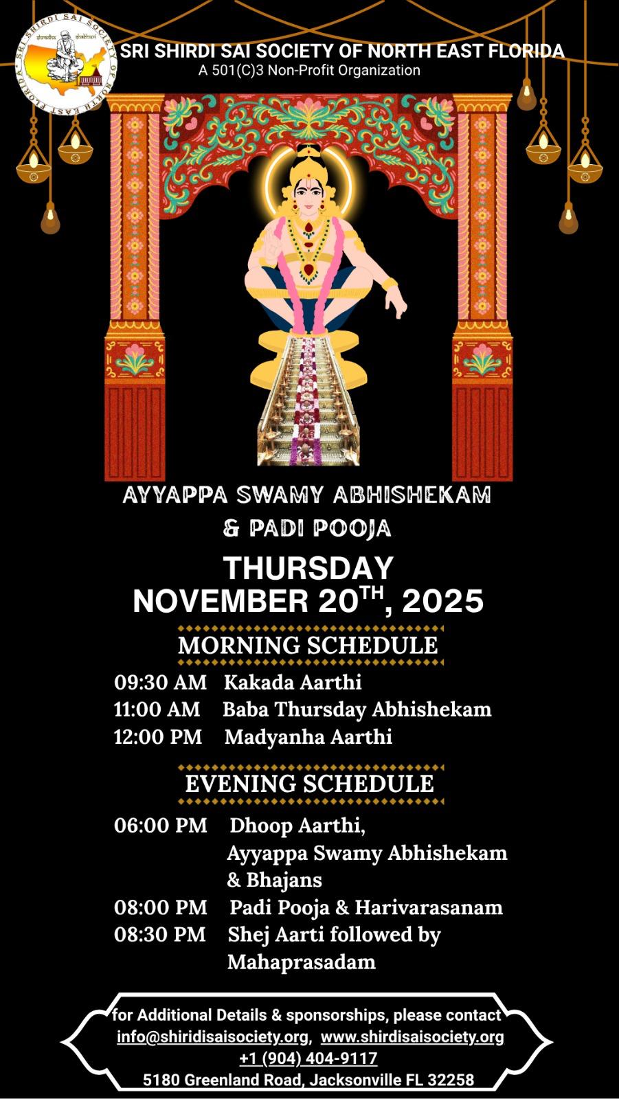 Ayappa Swamy Abhihekam & Padi Pooja + Add to Google Calendar Date Nov 20 2025 Time All Day Local Time Timezone: America/New_York Date: Nov 20 2025 Time: All Day Share this event