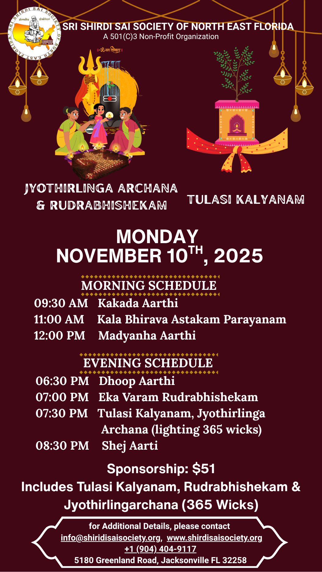Jyothirlinga Archana & Rudrabhishekam, Tulsi Kalyanam + Add to Google Calendar Date Nov 10 2025 Expired! Time All Day Local Time Timezone: America/New_York Date: Nov 10 2025 Time: All Day Share this event