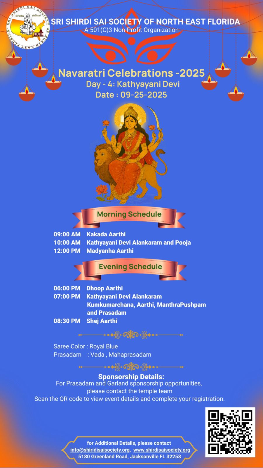 Navaratri – Day 4 – Kathyayani Devi + Add to Google Calendar Date Sep 25 2025 Expired! Time All Day Local Time Timezone: America/New_York Date: Sep 25 2025 Time: All Day Share this event
