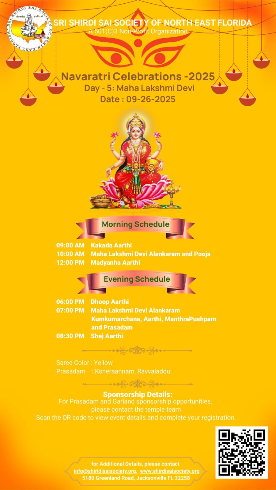 Navaratri – Day 5 – Maha Lakshmi Devi + Add to Google Calendar Date Sep 26 2025 Expired! Time All Day Local Time Timezone: America/New_York Date: Sep 26 2025 Time: All Day Share this event