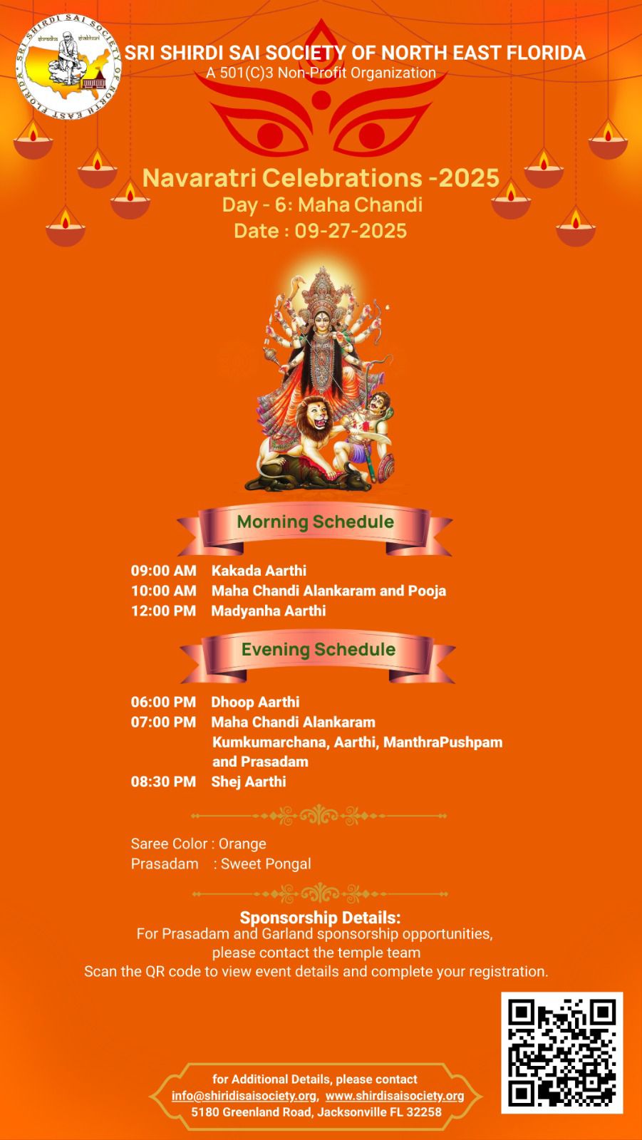 Navaratri – Day 6 – Maha Chandi + Add to Google Calendar Date Sep 27 2025 Expired! Time All Day Local Time Timezone: America/New_York Date: Sep 27 2025 Time: All Day Share this event