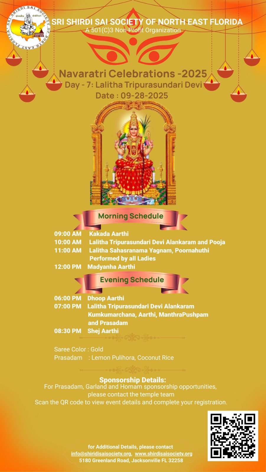 Navaratri – Day 7 – Lalitha Tripurasundari Devi + Add to Google Calendar Date Sep 28 2025 Expired! Time All Day Local Time Timezone: America/New_York Date: Sep 28 2025 Time: All Day Share this event