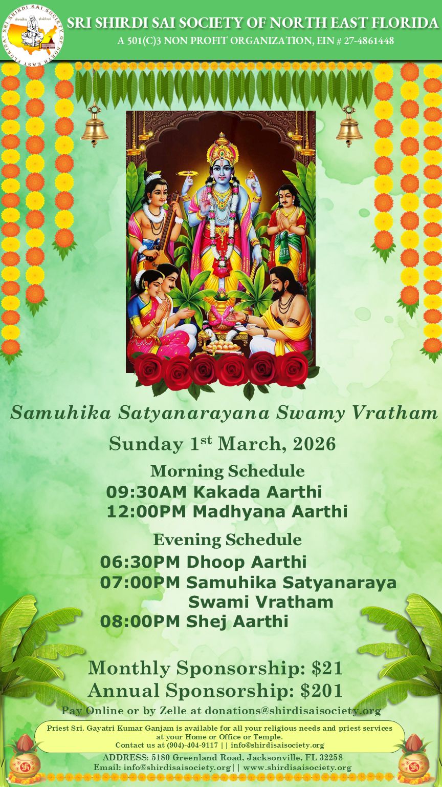 Samuhika SatyaNarayana Vratam (SSV) pooja + Add to Google Calendar Date Mar 01 2026 Expired! Time All Day Local Time Timezone: America/New_York Date: Mar 01 2026 Time: All Day Share this event